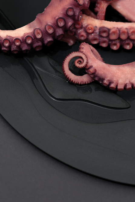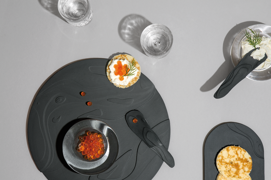 plates and spoons.A black underplate works as a space for dry foods like bread and also as the frame for the glass bowl, which is made out of solid, sandcasted glass. The contrast between